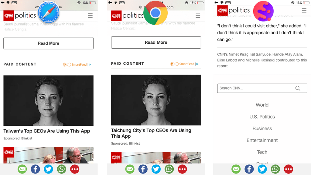 Take a CNN news article as an example. Cake Browser can read the full text without clicking the Read More button, and various recommended positions are removed.