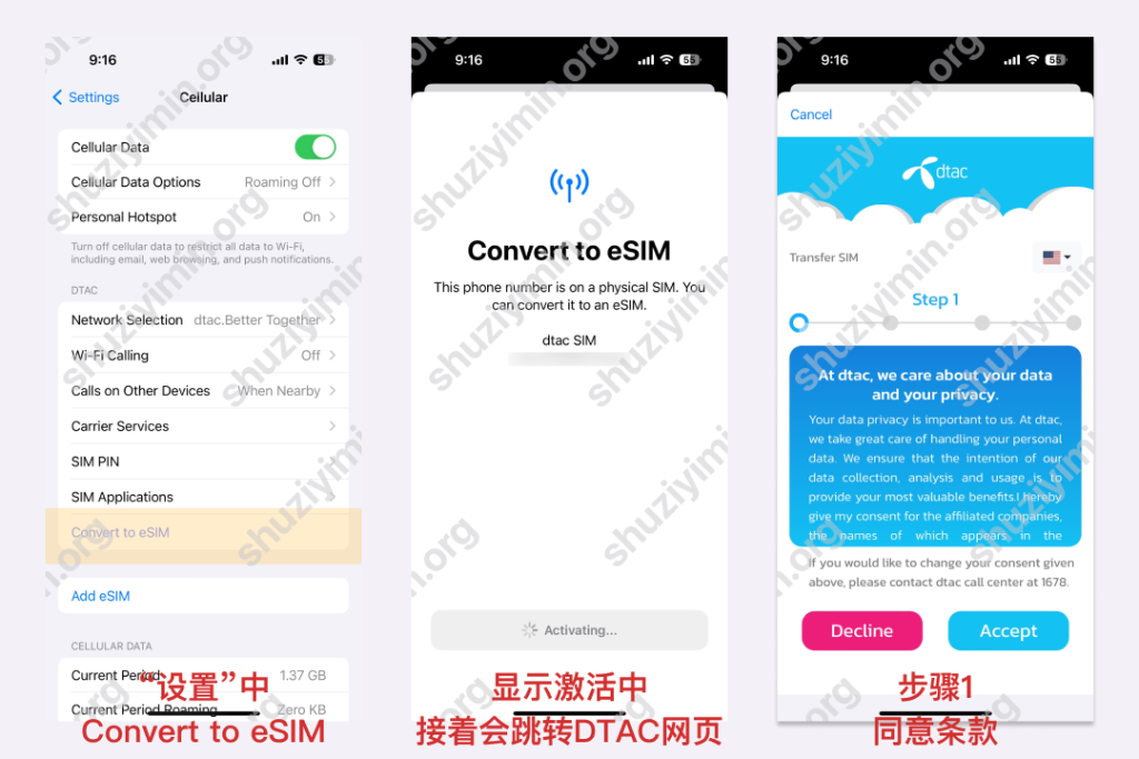 The tutorial for converting to eSIM is relatively simple. Insert the DTAC physical card into an iPhone that supports eSIM, find convert to eSIM in the iPhone cellular network settings, click it to jump to the DTAC webpage, and fill in the certificate information again. The message prompts that it will take about 10 minutes, but it can actually be completed in 3-5 minutes.