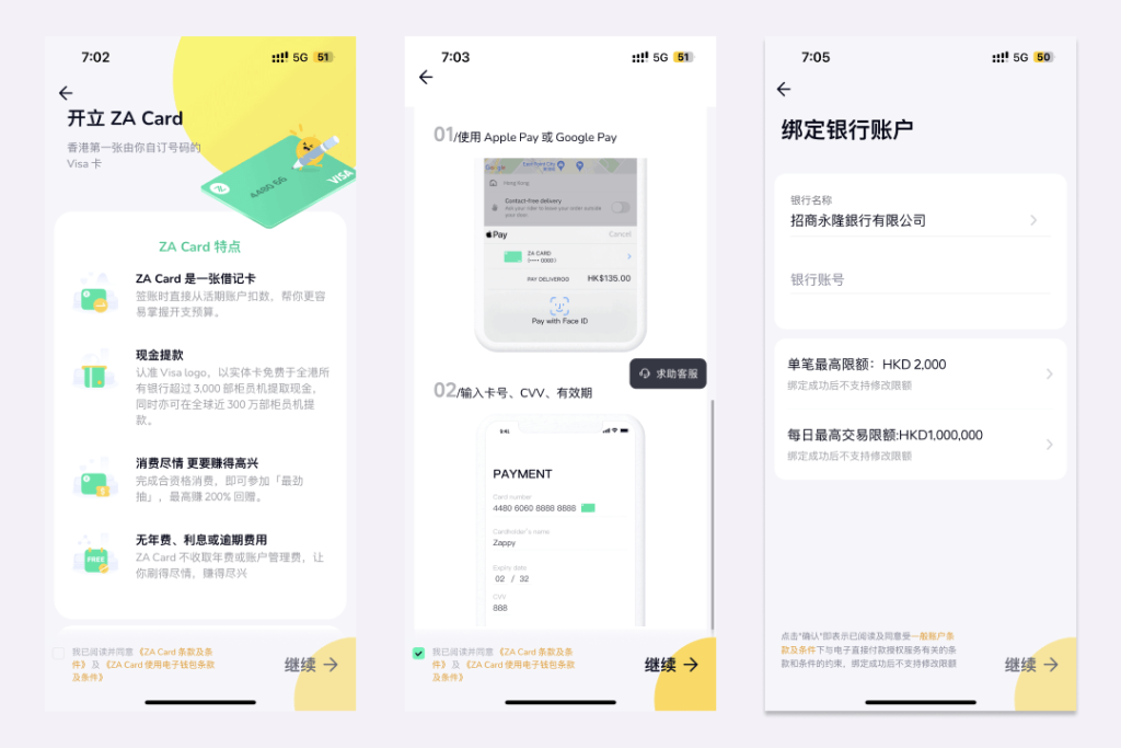 ZA BANK is a virtual bank in Hong Kong jointly established by real estate company Bestar Holdings, Zhong An Insurance, Chow Tai Fook, and AIA. It is currently one of only two Hong Kong banks that support mainland residents to open accounts through ID cards (the other is livi Bank). As long as you are physically in Hong Kong, download the app, and open an account in 20 minutes. You can have a Hong Kong bank account and pay for a physical Visa savings card (mailing fee is HK$25).