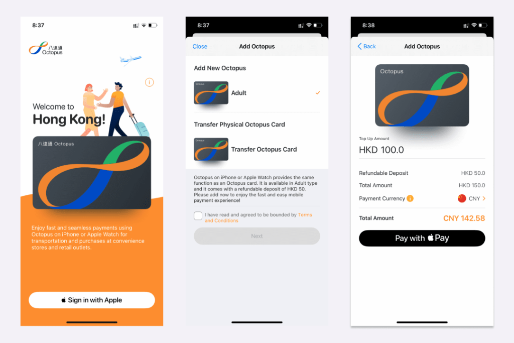 Octopus Tourist Edition is available on the App Store, supporting payment methods such as Visa, MasterCard, and UnionPay cards outside Hong Kong. After downloading the App, log in with your Apple ID and select a credit/debit card that has been linked to Apple Pay to recharge. Once you select a currency to recharge, you cannot change it later.