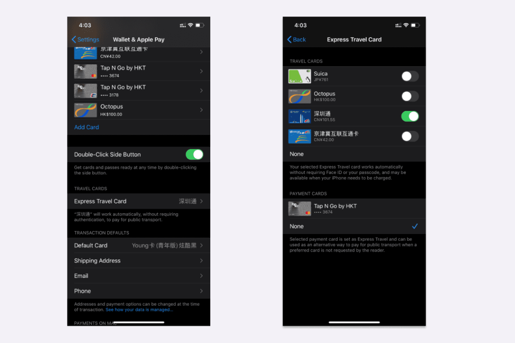 After activation or transfer, you can use it without Face ID, Touch ID or password. Set the default bus card in Settings-Wallet. Once the setting is completed, you only need to bring your iPhone or Apple Watch close to the card reader to pay or check, without waking up the device or opening the app.