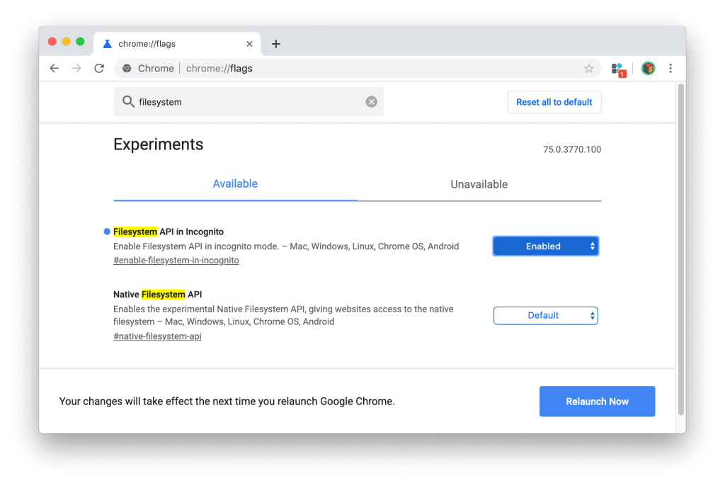 - Change the option of Filesystem API in Incognito from Default to Enable