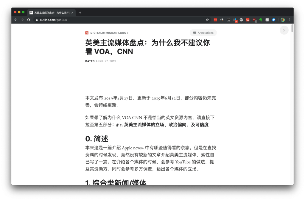 Outline.com is a free reading service. After you fill in the URL you want to read, Outline will automatically filter out various advertisements and plug-ins and only display the content. It is similar to reading articles in Pocket and other read-later software, but the difference is that most of the time, you cannot bypass the restrictions of news websites when using Pocket. The picture below shows the display of articles on this site in Outline, and all advertisements and unnecessary plug-ins have been removed.