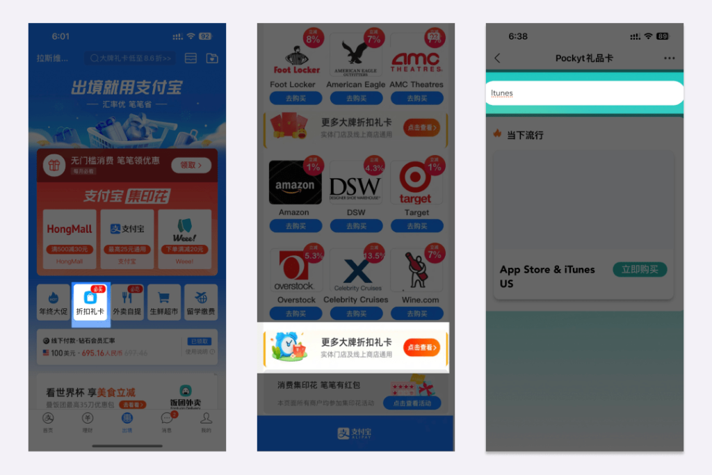 In Alipay, change the position of the upper left corner of the homepage to any state in the United States, and then a “Outbound” tab will appear in Alipay. Click “Discount Gift Cards”, slide to the bottom, and click “More Big Brand Discount Gift Cards” to enter the gift card purchase page. Search iTunes to recharge.