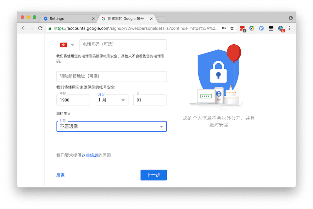 You can leave your mobile phone number and secondary email address blank; information such as date of birth, gender, email account, etc.