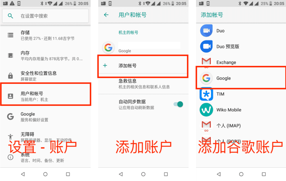 3.1 Go to “Settings” on your phone – “Users and Accounts” – “Add Account” – Select Google Accoun